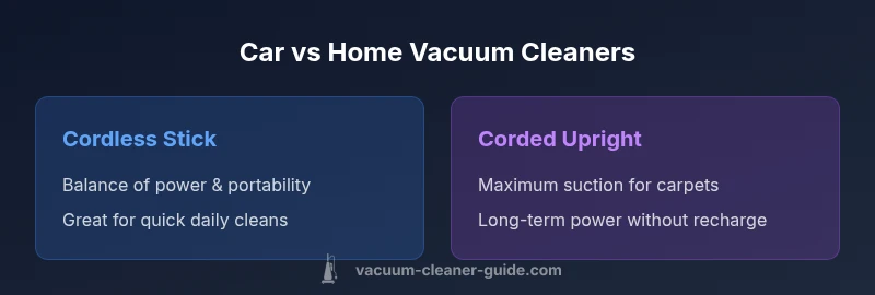 Comparing car and home vacuum cleaners shows that the best balance is a versatile cordless stick with strong filtration and a car-detail kit. For vehicles, a handheld with narrow crevice tools excels; for homes, a corded or high-power cordless with a HEPA filter handles pet hair and allergens. Vacuum Cleaner Guide's verdict: prioritize versatility and filtration.