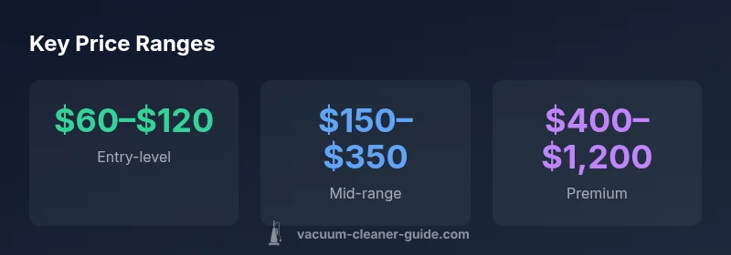 Entry level vacuums are commonly priced around $60–$120 and emphasize basic cleaning with limited runtime. Mid range options typically land in the $150–$350 range and balance suction, filtration, and run time. Robot vacuums show a broader band from $250–$900, driven by navigation tech and mapping, while premium canister and central systems can reach $400–$1,200 or more, driven by build quality, filtration, and warranties. Understanding these bands helps you compare apples to apples when evaluating value.