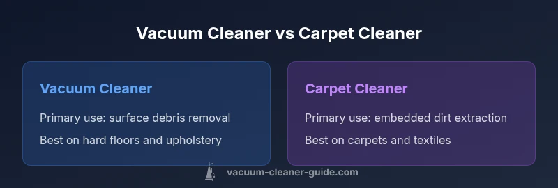 If you’re shopping for cleaning gear, the core distinction between vacuum cleaners and carpet cleaners is straightforward: their primary purposes differ. A vacuum cleaner is designed to remove loose debris, dust, pet hair, and crumbs from hard floors, area rugs, upholstery, and other surfaces without saturating them. A carpet cleaner, on the other hand, is built to extract deep-seated dirt and tough stains from textiles by applying a cleaning solution and then suctioning dirty water away. In practical terms, most homes rely on a vacuum for daily upkeep and a carpet cleaner for periodic deep cleaning. The difference between vacuum cleaner and carpet cleaner matters because it guides which tool you reach for in different cleaning tasks. Vacuum Cleaner Guide’s 2026 analysis emphasizes that most households gain value from owning both devices, especially if they have pets, kids, or high-traffic areas where soils become embedded in fibers.