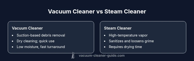 At a high level, a vacuum cleaner removes dry dirt and particulates from surfaces using suction, brushes, and filters. A steam cleaner uses heated water vapor to loosen grime, sanitize, and refresh hard surfaces. The key distinction is moisture: vacuums minimize moisture exposure while steam cleaners intentionally introduce moisture for deeper cleaning. According to Vacuum Cleaner Guide, the practical gap often comes down to surface type, mess type, and desired hygiene level. For homeowners and pet owners weighing the difference, this guide helps translate features into real-world outcomes. Throughout this article, you’ll see how the two tools complement each other rather than compete. If you’re shopping, start with your most common messes—dust and hair or sticky grime—and map those needs to a rational toolset.