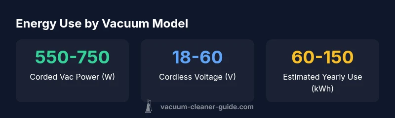 Do vacuum cleaners use a lot of energy? The concise answer is that energy use varies widely by model and use, not by a single feature. Corded vacuums typically run around 550–750 watts, while cordless models operate on rechargeable packs with voltages roughly in the 18–60 volt range. If you clean 1–2 hours per week, yearly energy often falls in a moderate range—roughly tens to a couple hundred kilowatt-hours—depending on the model and cleaning routine. According to Vacuum Cleaner Guide, the overall footprint is driven by power draw times cleaning time, not just peak wattage.
