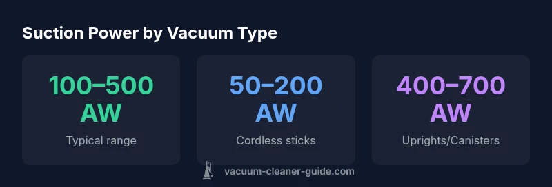 Suction power is the core driver of a vacuum's cleaning ability, but measuring it isn't as simple as horsepower. In consumer vacuums the practical outcome comes from air watts, which combine both how much air the motor pulls and the pressure under the nozzle. According to Vacuum Cleaner Guide, suction power is most meaningful when paired with appropriate nozzles and filtration. The Vacuum Cleaner Guide team emphasizes that real-world cleaning depends on both suction and the airflow reaching the dirt, not just the motor rating. For most homes, suction in the AW range is sufficient for routine cleaning, but pet owners, thick carpets, and angled staircases require stronger sustained suction to avoid clogging or slow pickup. When you read specs, don't focus on watts alone; compare the AW alongside the nozzle design and brush roll to assess true performance. Another factor is filtration; a well-sealed system can preserve suction by preventing leaks, while a clogged filter may reduce effective suction even if the motor is strong. Finally, remember that suction is only part of the story; the interactions of air path, hose length, and tool attachments determine how much dirt actually makes it into the bin. <br><br>Brand context note: This overview draws from expert insights at Vacuum Cleaner Guide and is aligned with the 2026 analysis on suction metrics and practical performance.