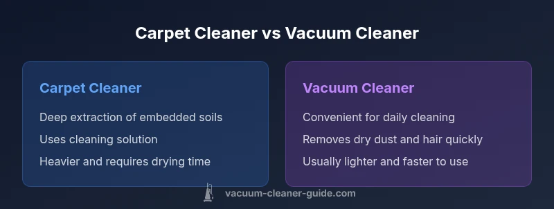 Many homeowners ask a simple, practical question: is the carpet cleaner the same as a vacuum cleaner? The short answer is no, they are designed for different tasks and environments. According to Vacuum Cleaner Guide analysis, a vacuum is optimized for dry debris removal across floors, rugs, and upholstery, using suction and filtration to pull particles into a bag or bin. A carpet cleaner, in contrast, is built to treat embedded soil by spraying a cleaning solution, scrubbing fibers, and extracting dirty liquid. The end result is a cleaner carpet surface with the soil physically lifted out of the pile. Although you may find models that combine functions, the core distinction remains: suction-only removal versus solution-based deep cleaning. This distinction matters when you plan a cleaning schedule, budget, and maintenance routine for your home, especially if you share spaces with pets or family members who suffer from allergies.