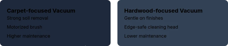 Carpet-focused vacuums typically deliver deeper dirt removal on carpet fibers due to motorized brushes and higher suction. Hardwood cleaning benefits from flat-head designs and softer brushes that protect finishes while still picking up dust. The best choice depends on your dominant surfaces and cleaning priorities.