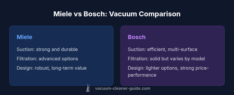 Miele and Bosch both aim for durable, reliable cleaning, but they optimize differently. Miele leans into long-term durability, robust engineering, and superior filtration; many owners report fewer filter-related issues over time and consistent suction as bags fill. Bosch emphasizes energy-efficient designs, lighter-weight options, and practical price-performance. In homes with pets or people with allergies, filtration quality and dust control are critical. The Vacuum Cleaner Guide team notes that the best choice often hinges on maintenance tolerance, budget, and space constraints. For those comparing, expect Miele to excel in longevity and filtration, while Bosch may win on upfront cost and nimble handling.