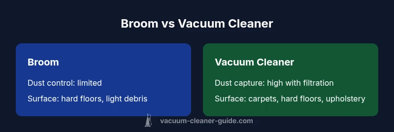 In many households, the simplest question we face is whether is vacuum cleaner better than broom. According to Vacuum Cleaner Guide, the answer hinges on cleaning depth, allergen control, and long-term convenience, not just immediate surface visibility. This guide approaches the topic with a practical, evidence-based lens rather than marketing rhetoric. If you’re balancing pet hair, dust, daily debris, and family members with allergies, the vacuum is typically the more effective tool. We’ll unpack how to assess performance, surface needs, and maintenance implications so you can choose with confidence rather than intuition. This section sets the stage for a rigorous, side-by-side assessment that mirrors real-world use in homes with varied flooring and traffic patterns.