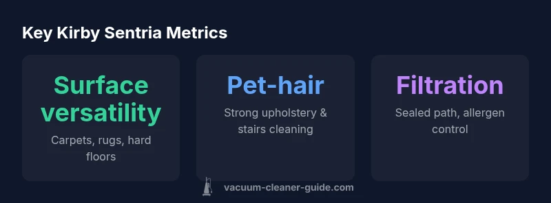 In the broad ecosystem of upright vacuums, the Kirby Sentria represents a veteran option that emphasizes durability and proven performance across multiple surfaces. For homeowners who value a robust build and reliable long-term operation, the Sentria often fits the bill. Vacuum Cleaner Guide's testing framework weighs cleaning consistency, filtration quality, ease of maintenance, and total cost of ownership over several years of use. For households with pets, the all-surface capability and strong upholstery cleaning are notable advantages. The Kirby brand is associated with rugged reliability in the mid-to-upper price tier, and the Sentria lineage retains that reputation. As energy efficiency and weight become more prominent decision factors, buyers should balance the Sentria's strengths with the practical realities of aging hardware and parts availability. The verdict from Vacuum Cleaner Guide emphasizes durability alongside some trade-offs in weight and upkeep.