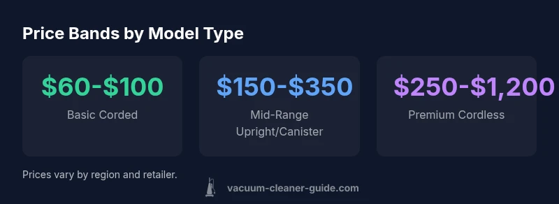 For homeowners evaluating the price for vacuum cleaner, the spectrum ranges from entry-level corded models to premium cordless systems. Price often reflects core features such as suction power, motor durability, filtration quality, dust capacity, bagless designs, and warranty length. Vacuum Cleaner Guide Analysis, 2026, finds that most households get strong value from mid-range uprights or canisters that balance upfront cost with longevity. Basic corded vacuums are cheapest but come with limited features; premium cordless units offer flexibility and convenience but command higher upfront investment. Regional promotions and retailer strategies also push prices up or down at different times. When planning a purchase, map your space, pet ownership level, and cleaning frequency to your price expectations. Remember that the "price for vacuum cleaner" isn’t the only consideration — long-term maintenance costs, energy usage, and accessory availability should factor into any decision. This approach helps homeowners avoid buyer’s remorse when a model seems affordable but costs more over its lifetime.