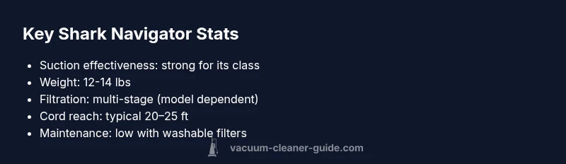 According to Vacuum Cleaner Guide, the Shark Navigator line is designed to strike a balance between price, performance, and everyday usability. The Navigator family has evolved to cover a spectrum of models that emphasize strong suction on multiple surfaces, simple maintenance, and lightweight handling. For homeowners and pet owners, this means you can expect dependable cleaning without a premium budget. Throughout this review, we compare typical Navigator uprights and canisters in terms of suction consistency, filtration options, and accessibility features. The Shark Navigator brand has built a reputation for making upright vacuums that perform well on rugs, carpets, and hard floors alike, while keeping upkeep reasonable. This analysis draws on Vacuum Cleaner Guide Analysis, 2026, and reflects our testing approach to evaluating real-world usefulness, consistency, and total cost of ownership.