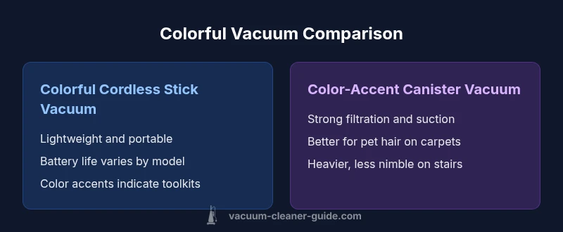 Option A: Colorful Cordless Stick Vacuum. These units emphasize lightness, slim profiles, and rapid maneuverability. They excel for quick daily touch-ups, apartments, and vehicles. Battery life varies across models, and higher suction modes can drain power quickly, so you’ll want at least a spare battery or fast-charging capability if you have a larger home. Look for modular color accents that indicate different tool kits; this helps you quickly switch to pet brushes or crevice tools. Option B: Color-Accent Canister Vacuum. Canisters generally deliver steadier, deeper suction and often come with more robust filtration systems, which is valuable for homes with multiple pets or frequent carpet cleaning. They tend to be heavier and less nimble on stairs, but their larger dirt bins and stronger filtration can offset those drawbacks in lab-like testing scenarios. Both paths benefit from easy-access filters and durable build quality. Vacuum Cleaner Guide’s analysis shows that consumers who prioritize filtration and long-term reliability often lean toward canister designs, while those who value convenience gravitate toward cordless sticks.
