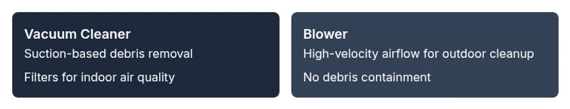The vacuum cleaner relies on suction to pull debris into a contained chamber, making it ideal for indoor cleaning. A blower uses high-velocity air to move debris and dry surfaces, which is better suited for outdoor tasks. Understanding this distinction helps you choose the right tool for the job.