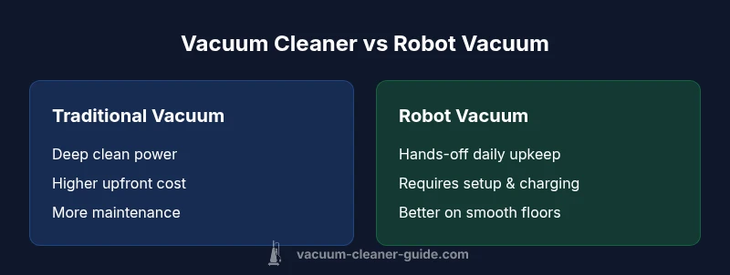 Choosing between a traditional vacuum cleaner and a robot isn't just about price; it's about how you live, how you clean, and how much you want to lift a finger. The vacuum cleaner or robot dilemma is common among homeowners and pet owners who want a cleaner home with minimal daily effort. According to Vacuum Cleaner Guide, the best path depends on your floorplan, the number of high-traffic zones, and whether you primarily need deep cleaning or regular upkeep. In practice, most households will benefit from at least one high-suction wand vacuum for deep cleans and a robot for routine maintenance. The keyword here is flexibility: you want a tool that complements other cleaning tasks, not creates more chores. When you map your options, you can treat both devices as teammates rather than rivals, ensuring you cover both the heavy lift and the light, daily upkeep that keeps a home consistently clean.