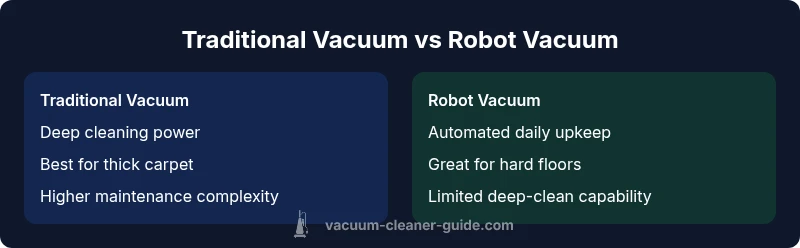 Traditional vacuum cleaners rely on a motor-driven suction fan, rotating brushes, and a bag or canister to collect dirt. They shine when you need deep cleaning, especially on high-pile carpets and stubborn spills. Robot vacuums, by contrast, use lidar or camera-based mapping, sensors, and compact suction to maintain cleanliness with minimal human intervention. They excel at routine maintenance and navigating complex floor plans. For many households, the best setup combines both: a traditional unit for periodic deep cleans and a robot for daily upkeep. Vacuum Cleaner Guide’s analysis shows that the right pairing depends on pet presence, floor variety, and tolerance for manual intervention.