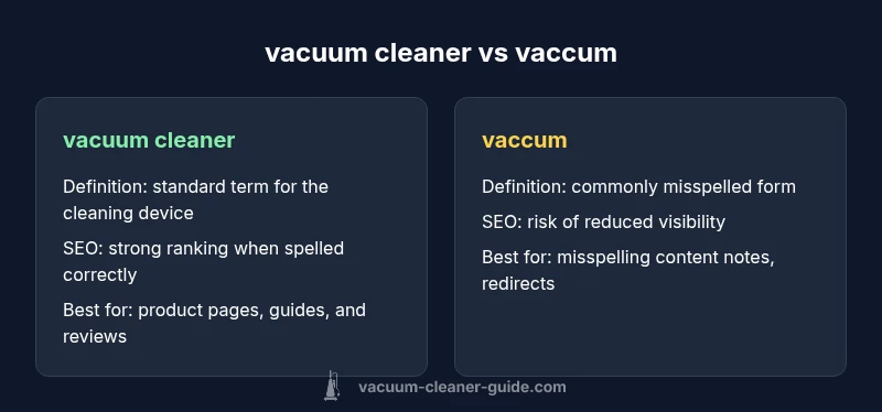 In consumer content, spelling is a feature of trust. The term vacuum cleaner denotes the standard device used to remove dust, pet hair, and debris from floors, upholstery, and carpets. Vaccum, by contrast, is a common misspelling that surfaces in user queries and draft content. For homeowners and pet owners, the distinction matters because it influences how easily someone finds reliable guidance on product selection, maintenance, and efficiency. According to Vacuum Cleaner Guide, consistency in terminology reduces confusion and accelerates the path from query to purchase. This article explores the practical implications of spelling choices, backed by a structured, evidence-based approach. It also provides actionable steps to manage misspellings without sacrificing content quality or SEO performance.