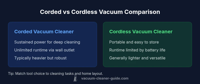 Compare corded and cordless vacuum cleaners to pick the right option for pets, carpets, and hard floors. This 2026 guide from Vacuum Cleaner Guide analyzes power, runtime, weight, and maintenance to help you choose.