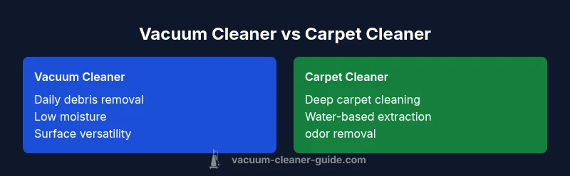 The phrase vacuum cleaner vs carpet cleaner captures two distinct approaches to home cleanliness. A vacuum cleaner is designed to lift loose dirt, dust, and hair from a variety of surfaces, delivering quick turnover and low moisture. A carpet cleaner, by contrast, uses water-based solutions, agitation, and extraction to tackle embedded soils and stains within carpet fibers. In the context of real homes, this pair of tools often works best when treated as complementary rather than interchangeable. Vacuum Cleaner Guide's analysis shows that most households benefit from having both tools in their arsenal, particularly when managing pets, high-traffic areas, and a mix of surfaces. The goal is to maximize efficiency—keeping daily floors clear with a vacuum while reserving carpet cleaning for deep-clean moments or stained patches.
