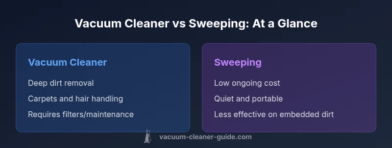 Vacuum cleaner vs sweeping is a practical question for homes that blend carpets, hard floors, and busy schedules. In most cases, a vacuum cleaner delivers deeper, faster dirt removal and better hair pickup, especially on carpets and upholstery, while sweeping remains effective for quick touch-ups on hard floors. The overall best approach, as Vacuum Cleaner Guide notes, is to combine both methods for a balanced clean. This TL;DR highlights where each method shines and how to deploy them together.