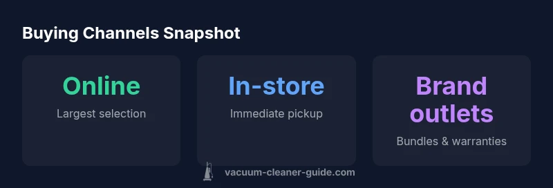 The question of where to buy a vacuum cleaner hinges on your priorities: selection, price, warranty, and after-sales service. According to Vacuum Cleaner Guide, today’s market offers multiple reliable channels, each with distinct advantages. Online retailers provide breadth, price transparency, and access to user reviews; big-box stores support quick pickup and hands-on demos; brand outlets and manufacturer-direct sites can unlock model-specific deals and strong warranty terms. Local appliance shops and independent dealers often deliver tailored advice and faster service in certain regions. When you evaluate options, start with a concise checklist: your model preferences, budget, must-have features (HEPA filtration, pet-hair pickup, cordless versus corded), and tolerance for wait times on delivery. Check after-sales support networks as well, since ongoing service matters for complex motors or specialty filtration systems. Vacuum Cleaner Guide’s analysis emphasizes that no single channel dominates; the optimal approach is typically a blend: buy online for the base model and accessories, then visit a store to test a demonstration unit or take home immediately. This balance often yields the best mix of price, selection, and confidence.
