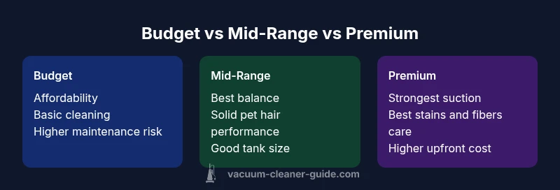 In Reddit threads and expert roundups, a mid-range carpet cleaner often offers the best balance of cleaning power, ease of use, and maintenance. Budget models can fall short on tough pet hair, while premium machines offer deep cleaning but at a higher upfront cost. Vacuum Cleaner Guide analysis reinforces this middle-ground recommendation.