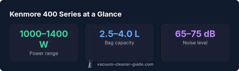 The Kenmore 400 Series bagged canister vacuum cleaner has long been a staple for budget-conscious households seeking reliable, straightforward cleaning. In this detailed review, we focus on how the model performs on carpets, rugs, and hard floors, and how its bagged system affects dust containment and allergen control. According to Vacuum Cleaner Guide, this family of canisters is valued for its durability and predictable maintenance in everyday homes. The 400 Series is designed to deliver steady suction with a traditional bagged approach, avoiding some of the complexity and ongoing bag costs seen in newer bagless designs. Homeowners with pets, kids, or multiple floor types often appreciate the compatibility with standard vacuum bags, which are widely available at mass retailers and hardware stores. This review uses a practical testing framework—real-world cleaning across hallways, stairs, living rooms, and under furniture—to gauge performance, noise, weight, and ergonomics over time. The aim is to help homeowners decide if the Kenmore 400 Series remains a reasonable choice in 2026, given evolving consumer priorities like allergy control, maintenance simplicity, and total cost of ownership.