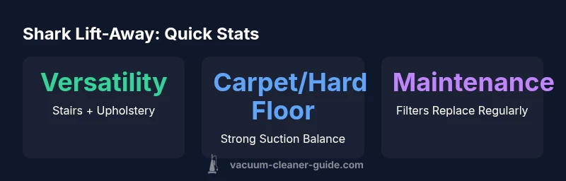 The Shark Lift-Away vacuum is an upright with a detachable canister that can be released for handheld cleaning. This design targets households with stairs, pets, and a mix of carpet and hard floors. The model is known for letting you carry cleaning power into tight spaces without switching machines, which is especially useful for upholstery, stair treads, and car interiors. In this review, we evaluate how the Lift-Away handles everyday messes, allergens, and high-traffic areas. According to Vacuum Cleaner Guide, its core strength is versatility across surfaces and configurations, which helps homeowners reduce the number of cleaners they rely on. Throughout testing, we consider suction balance, accessory usefulness, filtration integrity, and durability to determine if this Shark is a long-term fit for busy homes.