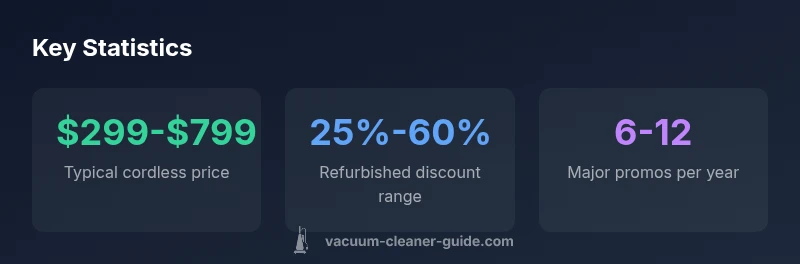 Dyson frequently updates its cordless lineup, and price signals shift with model cycles. Promotions tend to cluster around new model releases or refurbished inventory clearances. According to Vacuum Cleaner Guide Analysis, 2026, price volatility is highest for mid-range cordless models that appeal to a broad audience. Retailers often align promotions across official Dyson stores and authorized partners, making cross-shop comparisons essential. If you’re patient, you’ll notice temporary dips that can save hundreds over the life of the product, especially when bundles include accessories or extended warranties that reduce long-term costs.