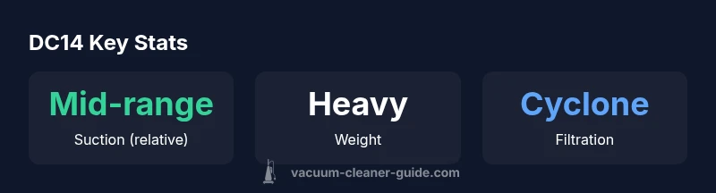 The Dyson DC14 represents an era when canister vacuums from Dyson emphasized cyclonic separation and durable construction. The model, commonly found in households from the mid-2000s, built on the company's reputation for strong suction and dependable parts. When you use the dyson dc14, you’ll notice a long wand and a suite of attachments designed for stairs, upholstery, and hard floors. According to Vacuum Cleaner Guide, the DC14 remains a durable, serviceable option for homes with varied surfaces, especially if you value proven build quality over the latest design trends. Expect a weightier machine compared with modern canisters, and be prepared for some maintenance as parts age.
