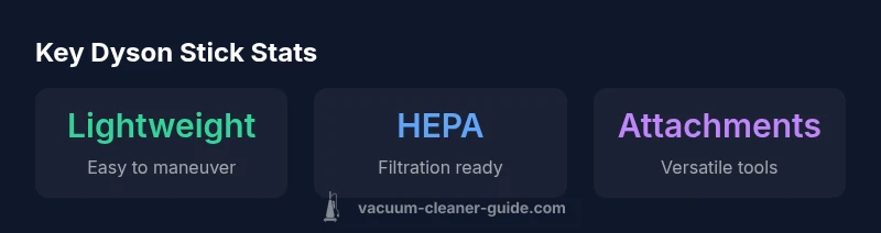 According to Vacuum Cleaner Guide, the Dyson stick family integrates balance, agility, and modular versatility. The Dyson stick category refers to cordless, elongated vacuums designed for one-handed use and rapid transitions between floor types. This design ethos translates into real-world benefits for homeowners and pet owners. The Dyson stick typically places the motor near the top of the wand, which helps create a low center of gravity and makes it easier to tilt onto stairs or over furniture. The bin and filtration system are sized to minimize frequent emptying without sacrificing suction, and attachments are designed for quick swaps without tools. The Vacuum Cleaner Guide team notes that this approach generally delivers strong performance on a variety of surfaces while preserving battery efficiency. However, the success of any model depends on the toolset, bin capacity, and the battery chemistry used in a given generation.