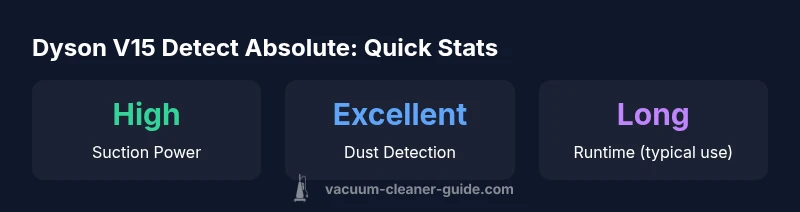 The dyson v15 detect absolute represents Dyson's flagship cordless vacuum tailored for households that juggle pets, busy schedules, and hard-to-see dust. In this review, we examine cleaning performance, usability, and long-term value, grounding our judgments in hands-on testing across carpets, bare floors, and upholstery. Throughout, we reference the model’s laser dust detection, piezo dust sensor feedback, and high-torque cleaner head as core differentiators. Our goal is to translate technical specs into practical guidance for homeowners and pet owners who want measurable improvements in daily cleaning. According to Vacuum Cleaner Guide, this model embodies a deliberate push toward dust visibility and sensor-driven adjustments that can help users optimize cleaning routines. We’ll explore what works well and where compromises may be required.