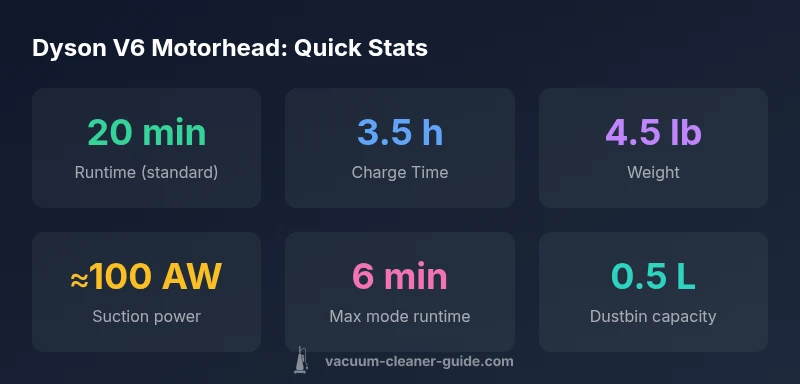 The Dyson V6 Motorhead is a compact, cordless stick vacuum designed to deliver Dyson-level suction without a cord. When evaluating this model, it's important to understand its place in the Dyson lineup and how it stacks up for common home cleaning tasks. For readers of Vacuum Cleaner Guide, the V6 Motorhead represents a classic shift toward lightweight, easy-to-use cleaning tools that still prioritize deep carpet agitation. In this review, we focus on performance across surfaces, runtimes, and practical usability, especially for households with pets or children. The V6 Motorhead's direct-drive cleaner head produces robust suction at the brush bar, making short work of embedded pet hair on medium-pile carpets and area rugs. The motor is powerful for its size, and the intake remains aggressive enough to pull dust from tight corners. Yet, because it's an older generation of Dyson cordless, some users will notice tradeoffs in runtime, tool versatility, and filtration compared with newer models in the same class. As with all Dyson products, expect a premium feel, meticulous manufacturing, and a design that emphasizes quick adaptability for daily cleaning tasks. In short, dyson v6 motorhead offers strong core cleaning power, but you'll need to manage runtime and tool selection if your home demands prolonged sessions.