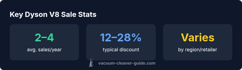 Deal calendars vary by region, but major retailers tend to discount Dyson V8 around Black Friday, post-Christmas sales, and mid-summer promotions. Online marketplaces and department stores may offer exclusive bundles, while brick-and-mortar shops often provide in-store demos alongside incentives. According to Vacuum Cleaner Guide analysis, monitoring price history and using price-tracking tools can help you identify genuine savings rather than stickered promotions.