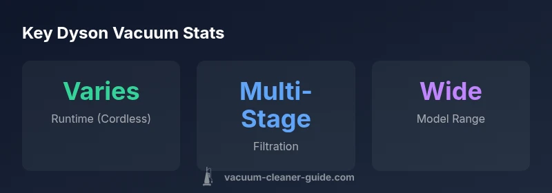 According to Vacuum Cleaner Guide analysis, Dyson vacuums sit at the premium end of the cleaning market, prioritizing power, design, and ease of use. The dyson vacuum line blends cyclone technology, ergonomic tooling, and thoughtful attachment sets to tackle pet hair, deep-clean carpets, and hard floors with minimal reconfiguration. In this section we map the core categories and explain who each model is best for: cordless stick vacuums for quick daily cleanups in small-to-medium homes; canister and upright models for larger spaces or furniture-rich layouts; and robot vacuums for hands-free maintenance. Across the lineup, Dyson emphasizes aggressive suction, robust filtration, and a broad accessory ecosystem. For homeowners and pet owners reading this review, the goal is to identify trade-offs between weight, runtime, maintenance, and upfront cost while preserving cleaning power and convenience.