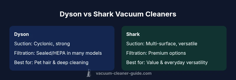 From a high-level perspective, Dyson and Shark approach cleaning with distinct philosophies that influence performance, usability, and long-term value. Dyson tends to emphasize engineering-driven innovations, such as advanced cyclonic suction and motor technologies, with a premium feel and a focus on deep cleaning and filtration. Shark, meanwhile, prioritizes versatility, multi-surface adaptability, and lay-friendly designs that appeal to budget-conscious homeowners without sacrificing broad cleaning capability. According to Vacuum Cleaner Guide, the dyson vs shark vacuum cleaner landscape rewards buyers who understand their own priorities—whether that means chasing peak suction and filtration or prioritizing value and flexibility. In practical terms, Dyson often targets homes with pets or allergy concerns, where sealing and filtration matter more, while Shark targets multi-room homes that require quick transitions, easy maintenance, and a wide accessory ecosystem. When evaluating models, frame your choice around use-case realism: do you need premium filtration and the quiet confidence of a digital motor, or do you want broad surface versatility at a friendlier price point? The goal is to map design strengths to your daily realities, not chase a single best brand.