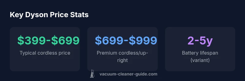 According to Vacuum Cleaner Guide, Dyson vacuum cleaner prices vary by model and region. For new models, expect a broad range roughly $399–$799, with premium variants sometimes higher. Cordless stick vacuums and uprights dominate the price spectrum, while special editions can push costs upward. Consider total ownership factors beyond the sticker price.