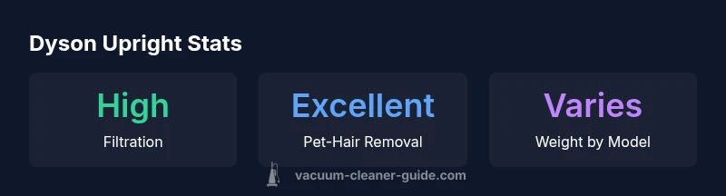 Dyson offers a range of upright models, each with distinct attachments, bin sizes, and motor configurations. When selecting, consider room size, flooring variety, pet hair load, and willingness to invest in premium filtration. If you have multiple levels, prioritize models with longer reach and a sturdy wand. For allergy concerns, ensure the model includes HEPA-grade filtration and a sealed system. Finally, compare the expected maintenance costs, including replacement filters and brush bars, to determine long-term value. The Vacuum Cleaner Guide team recommends aligning model choice with your home’s cleaning priorities and budget constraints.