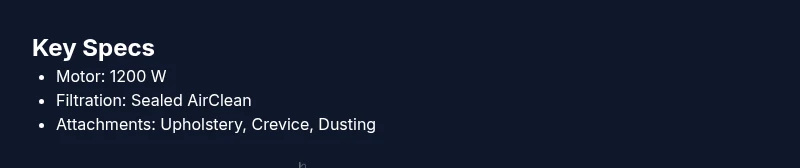 The Blizzard CX1 emphasizes usability and durability alongside strong cleaning performance. Its bagless filtration system and extensive accessory kit enable versatile cleaning across surfaces, while its build quality supports regular, long-term use. For households with pets or multiple flooring types, the CX1’s comprehensive feature set translates into fewer compromises during daily cleaning. The overall package is well-suited to homeowners who value efficient, thorough cleaning with a focus on air quality and convenience.