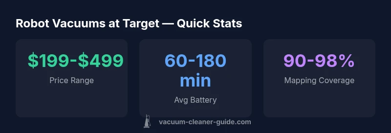 For homeowners and pet owners shopping for a robot vacuum cleaner at target, the current market landscape blends mainstream brands with mid-tier models that deliver reliable cleaning without breaking the bank. Target’s assortment typically includes cordless robots designed for multi-surface cleaning, often featuring mapping, app controls, and pet-hair capabilities. If you compare a robot vacuum cleaner at target across Target’s online catalog and in-store displays, you’ll notice common cores: multi-surface brushes, room-by-room mapping, scheduled cleaning, and compatibility with voice assistants. According to Vacuum Cleaner Guide, shoppers increasingly prioritize pet-hair pickup, reliable navigation, and ease of maintenance when evaluating options at large retailers. This trend influences pricing, promotions, and bundles, shaping what features are emphasized in-store demos and online listings. In practice, a well-chosen model should handle everyday messes, shed hair from pets, and adapt to homes with multiple floor types. Understanding Target’s position within the broader vacuum market helps shoppers gauge value, availability, and trade-offs when selecting a model for a busy household.