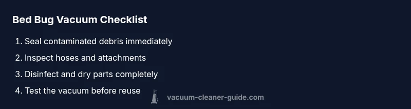 If you suspect bed bugs have entered your vacuum cleaner, begin with containment and a careful inspection. 1) Power off, unplug, and remove the bag or empty the canister outside, sealing the bag in a second plastic bag. 2) Wipe interior surfaces with a damp cloth and a mild disinfectant, avoiding harsh chemicals that could damage plastic parts. 3) Inspect hoses and attachments with a flashlight; detach and brush out any debris, then run the hose-cleaning attachment to dislodge trapped pests. 4) Replace the bag or dry the canister completely before reuse, and store the bag in a sealed container away from living spaces. If you prefer, use a washable fabric bag and launder it after use. A full overhaul may be required if signs persist after cleaning, and consider calling a pest professional if you live in an apartment or multi-unit building.
