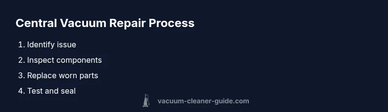 Central vacuum systems provide powerful, centralized suction through a network of hidden pipes connected to inlets around the home. When something goes wrong, symptoms can include reduced suction, unusual noises, or visible leaks at joints. Typical repair needs include fixing pipe or inlet leaks, replacing worn gaskets, cleaning or replacing clogged hoses, and addressing motor or switch faults in the power unit. By understanding the system layout— the canister, the mainline trunk, and the wall inlets— you can narrow down where issues originate. This guide explains common failure points and practical, homeowner-friendly repair approaches that emphasize safety and reliability. According to Vacuum Cleaner Guide, many routine issues are caused by leaks or blockages that are easy to fix with common tools. When addressed promptly, these repairs restore performance, protect indoor air quality, and prevent minor problems from becoming major outages.