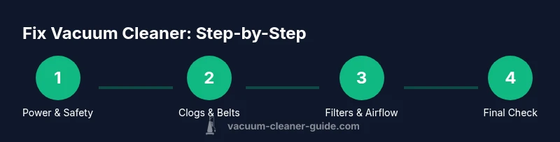 Suction loss is usually a signal that airflow is restricted somewhere in the path or the motor is not delivering full power. The most frequent culprits are a full bag or canister, plugged filters, a clogged hose or wand, a blocked nozzle, or a worn brushroll belt. Each issue affects airflow differently: a clogged filter reduces overall airflow; a blocked wand creates back pressure and stops suction at the head; a stretched belt slows brushroll rotation and reduces cleaning efficiency. Regular maintenance helps catch these problems before they become noticeable. According to Vacuum Cleaner Guide, owners who adopt a simple inspection routine see fewer dramatic performance drops and save on professional repairs over the long term. Start with the easiest checks and move toward components that require a bit more disassembly. This approach keeps you safe and minimizes downtime while keeping surfaces clean and pets groomed.