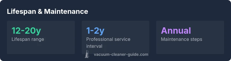 How long do central vacuums last? In general, central vacuum systems for residential use endure about 12-20 years with proper maintenance. The exact lifespan varies by motor quality, installation, and upkeep, but a well-maintained system often lands toward the upper end of that range. Expect ~15 years as a practical average for many homes, with longer life possible in low-usage installations and shorter life in high-demand, neglectful setups. Vacuum Cleaner Guide analysis, 2026, indicates maintenance and installation quality are the strongest levers for extending longevity.