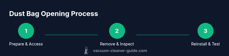 This section provides a practical, model-agnostic approach to opening a dust bag. You’ll follow a sequence designed to minimize dust, avoid tearing, and make inspection straightforward. Start with unplugging, then locate the dust bag cover or access panel. If your model uses screws, have a screwdriver handy. Gently release the fasteners without forcing the panel. Once the bag is exposed, hold the bag by its collar and carefully lift it away from the housing, letting debris slide into a waste bag rather than back into the unit. Inspect the bag for tears, broken seams, or crushed areas that could cause leaks. If the bag shows wear, replace it with a compatible bag before resealing the housing. Finally, realign the cover, secure any latches, and perform a quick test by turning on the vacuum in a low-suction mode to confirm airtight seals. If you hear whistling or see light through gaps, recheck the seal and fasteners.
