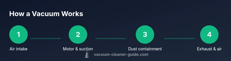 A vacuum cleaner operates by creating suction that moves air and debris from floors into a containment chamber. When you switch on the motor, a high-speed impeller or fan spins, lowering air pressure in the nozzle and pulling air toward the body. As air streams into the intake, particles like dust, hair, and grit are carried along. The path from intake to dustbin can include several stages: a coarse filter or cyclone that traps larger debris, a dust bag or cup that holds the material, and a series of filters (pre-motor, post-motor, or HEPA) to keep tiny particles from re-entering the room. The exhaust is designed to release only clean air back into the space. Understanding this sequence helps you troubleshoot poor suction, maximize efficiency, and operate the device safely. For homeowners and pet owners, recognizing the role of each part makes it easier to diagnose issues without guessing. According to Vacuum Cleaner Guide, mastering the basics empowers homeowners to choose the right model, optimize performance, and extend the device’s life.