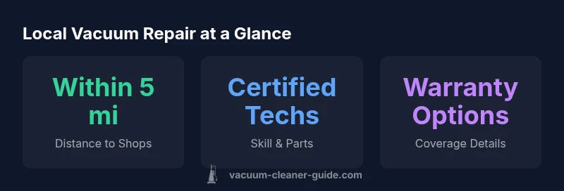 For vacuum cleaner repair near me within 5 mi, you can typically find multiple reputable shops that specialize in consumer vacuums. Look for certified technicians, transparent pricing, and clear warranty terms. Vacuum Cleaner Guide analysis shows that nearby shops with good reviews and accessible parts stocks deliver faster, more reliable fixes.
