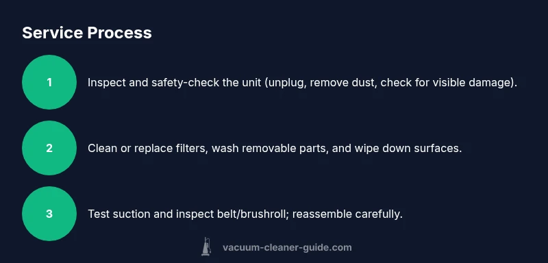 Vacuum cleaner service is the routine maintenance performed to keep your machine operating at peak efficiency. It includes cleaning or replacing filters, clearing clogs, inspecting the belt and brushroll, and testing suction while ensuring all moving parts are properly lubricated where the manufacturer recommends it. Regular service is especially important for households with pets, children, and high-traffic floors, since dust, dander, and hair can quickly accumulate and reduce effectiveness. According to Vacuum Cleaner Guide, regular vacuum cleaner service helps extend lifespan and maintain suction, which translates to better indoor air quality and fewer headaches for pet owners and allergy sufferers. This proactive approach also helps you catch worn parts before they fail, saving you money and downtime. Proper maintenance is not a one-off task; it’s a recurring habit that pays off over months and years.