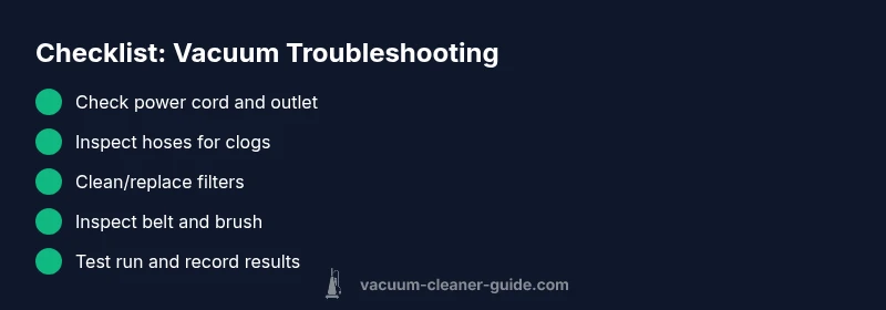 Most vacuums stop working due to simple power or clog issues rather than a blown motor. Quick steps to regain suction: 1) unplug and inspect the power cord and outlet for damage, 2) check the hose, wand, and attachments for clogs, 3) empty or replace the bag/filter and clean the roller, 4) check belt tension and re-seat components, 5) reset if your model has a reset button.