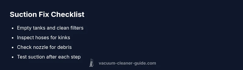 If you're asking why does my carpet cleaner stop suctioning, you're not alone. Most suction drops come from airflow restrictions that block the path from the water tank to the nozzle. Common culprits are clogged filters, a full dirty tank, or a blocked hose. Over time, brush debris or scale can build up in the head, seals can wear, and lids that aren't sealed can leak air. This guide from Vacuum Cleaner Guide outlines the most probable causes and how to verify them quickly. Addressing these issues often restores suction without expensive repairs.