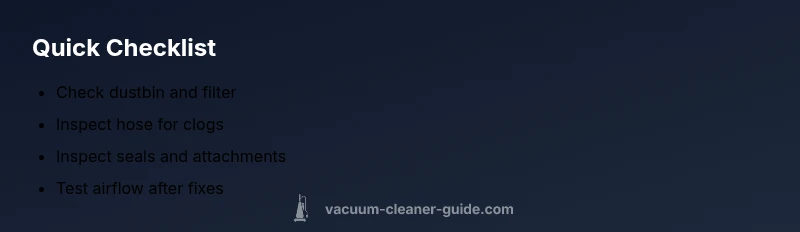 Before diving into parts, perform a quick, safe check sequence. First, unplug the vacuum and remove the dustbin. Empty it completely and wipe it dry. Inspect the filter: if it’s a foam or paper type, rinse if permitted by the manual or replace if it’s dirty. Check the hose for visible blockages, detach attachments, and look for kinks. Reassemble loosely to test suction after each step. If suction remains weak, proceed to more thorough checks. This approach minimizes risk and speeds up resolution. Remember: safety first—never operate a plugged-in vacuum with the cover off.