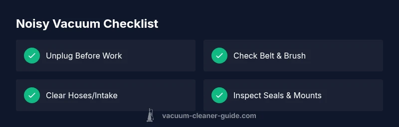 If you ask 'why does my vacuum sound weird', you're not alone. Odd sounds are the vacuum's way of telling you something is rubbing, loose, or obstructed inside. According to Vacuum Cleaner Guide, the most common root causes are a worn belt, a tangled brush roll, or a loose mounting near the agitator. Less frequent but serious culprits include damaged bearings, a misaligned impeller, or an air leak in the intake. The good news: most noises come from components you can inspect or service at home with basic safety steps. By listening carefully to the sound—whether it’s a grinding rattle, a squeal, or a piercing whistle—you can narrow down the likely area. This section helps you translate those sounds into practical checks and safe fixes, with guidance that emphasizes prevention as much as repair. The goal is to empower homeowners and pet owners with clear steps, so you can decide whether a quick at-home fix is enough or professional service is needed.