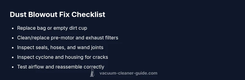 Dust blowing from a vacuum during operation is usually a signal that something is restricting airflow or letting it escape. Vacuum Cleaner Guide Analysis, 2026 shows that the most frequent culprits are a clogged filtration system or a full bag, followed by damaged seals, cracks in hoses, or loose attachments. Each of these issues reduces suction and allows fine particles to leak through. In some cases, a worn cyclone or seal in the wand can also cause a dusty blast. The key is to identify the exact source of airflow loss, not just the visible dust on the floor. Remember: even small leaks can produce visible dust clouds inside your room and reduce cleaning effectiveness.